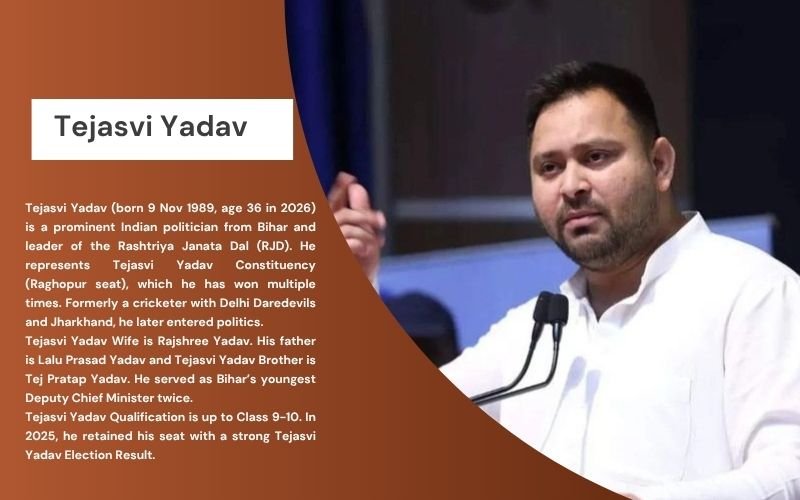 Tejasvi Yadav (born 9 Nov 1989, age 36 in 2026) is a prominent Indian politician from Bihar and leader of the Rashtriya Janata Dal (RJD). He represents Tejasvi Yadav Constituency (Raghopur seat), which he has won multiple times. Formerly a cricketer with Delhi Daredevils and Jharkhand, he later entered politics.Tejasvi Yadav Wife is Rajshree Yadav. His father is Lalu Prasad Yadav and Tejasvi Yadav Brother is Tej Pratap Yadav. He served as Bihar’s youngest Deputy Chief Minister twice.Tejasvi Yadav Qualification is up to Class 9-10. In 2025, he retained his seat with a strong Tejasvi Yadav Election Result.
